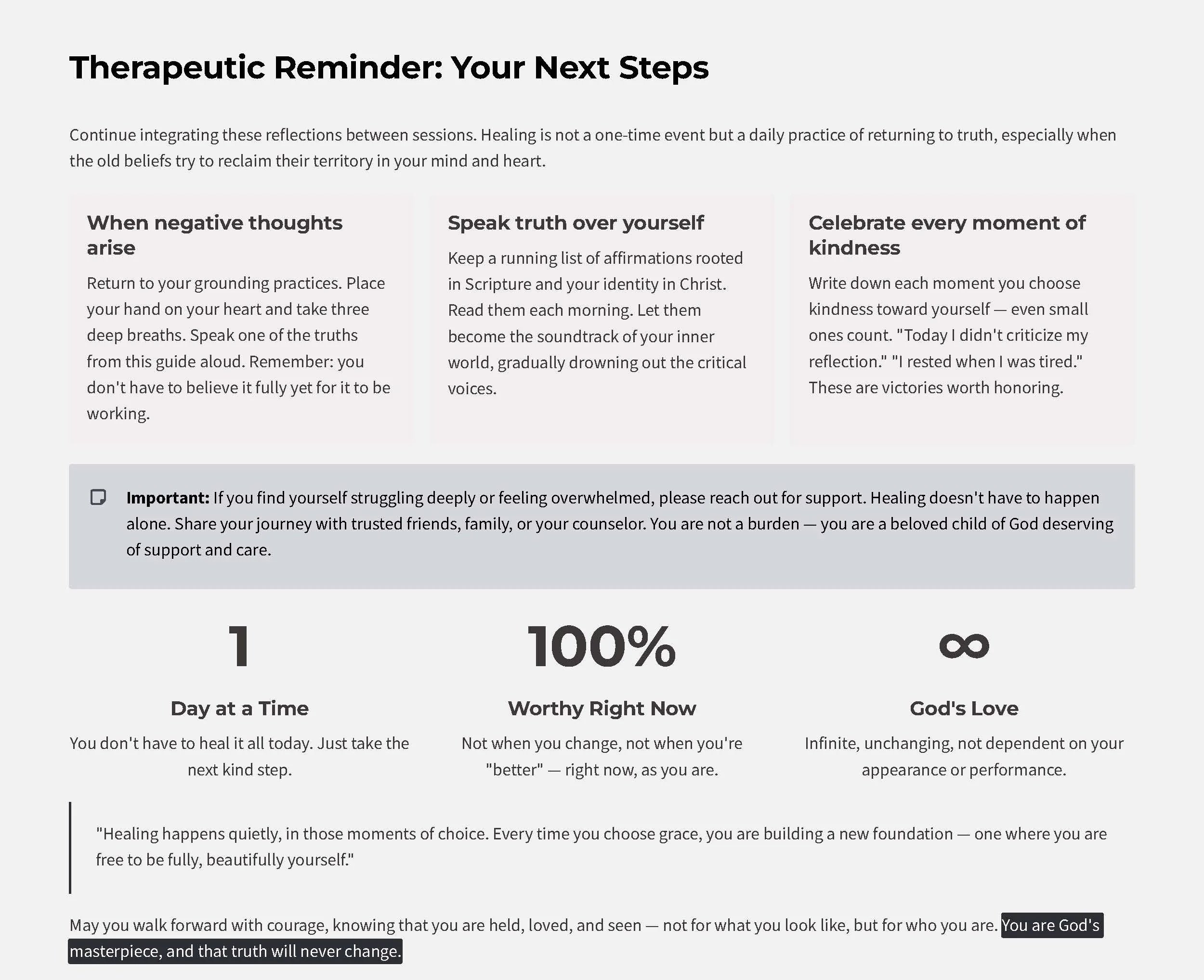 When negative thoughts arise. Return to your grounding practices. Take three deep breaths and place a hand on your heart. Speak one of the truths you have learned about yourself. Remember you do not have to belive this fully yet. Keep listing affimations. They can be rooted in scripture and your identity with Christ. Read them each morning and let them become a soundtrack of your inner world, making the critical voices less loud. Lastly, celebrate every moment of kindness, Write down each moment you choose kindness toward yourself (even the small ones) These victories are worth honoring. Take one day at the time and remember you are 100% worthy of love right no. God’s love is infinate.